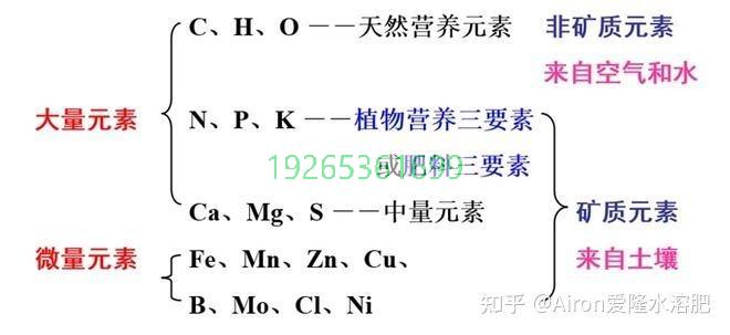 微量元素(占干重<0.01%): 铁(Fe)、锰(Mn)、锌(Zn)、铜(Cu)、钼(Mo)、硼(B)、氯(Cl)、镍(Ni)。 这些元素由国际植物营养学会定义,需同时满足三个标准:缺乏时植物无法完成生命周期、功能不可替代、直接参与生理作用。